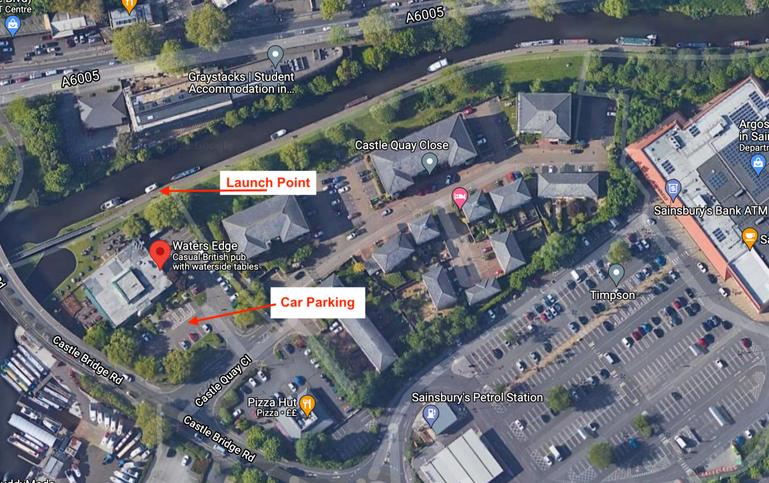 Car parking is available on site at the Waters Edge Pub payable by cash or by the PayByPhone App